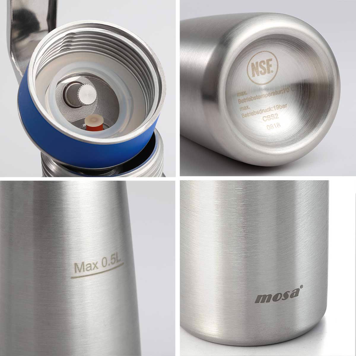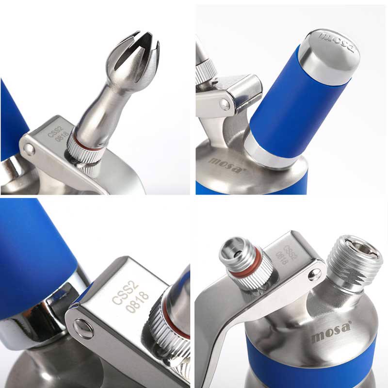 Bình được thiết kế mới thon gọn hơn với vạch định mức trên thân bình. Trên nắp & thân dưới có dập logo & các thông số dưới đáy bình. Toàn bộ dòng sản phẩm bình kem Mosa đạt chứng nhận tiêu chuẩn an toàn chất lượng ISO -TUV - NSF quốc tế. Chỉ có ở MOSA bình kem inox chính hãng với đầu bắt bông kem inox & ống đựng gas bằng inox sạch sẽ, cực bền.